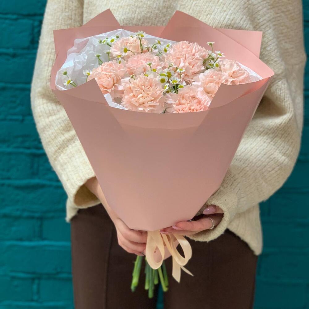 Букет из гвоздики (диантусов) и ромашки (танацетума) в Павловске